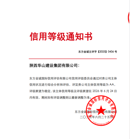 近日,国内知名评级机构东方金诚国际信用评估有限公司正式发布报告,确认陕西华山建设集团有限公司主体长期信用等级为aa,评级展望为稳定。这是集团连续两年获得该评级,充分体现了资本市场对集团战略规划、财务稳健性、行业竞争力及可持续发展能力的高度认可。
