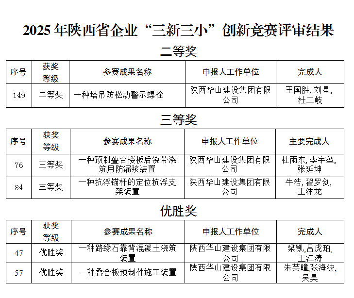 近日,由陕西省国资委、省科协、省工信厅等单位联合举办的2025年“三新三小”活动评选结果公布。经网上申报、初评推荐、形式审查、复赛选拔和决赛评审等环节,陕建华山建设集团推荐的《一种塔吊防松动警示螺栓》《一种预制叠合楼板后浇带浇筑用防漏浆装置》《一种抗浮锚杆的定位抗浮支架装置》《一种路缘石靠背混凝土浇筑装置》《一种叠合板预制件施工装置》等5项成果,分别获得二等奖1项、三等奖2项、优胜奖2项。